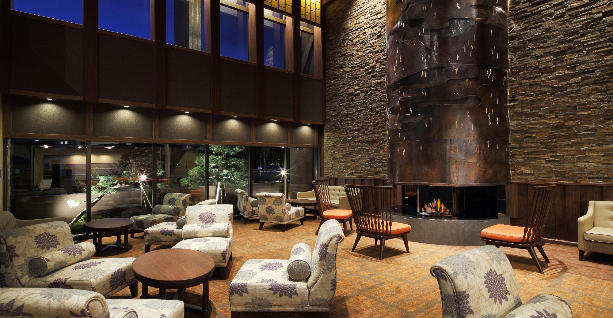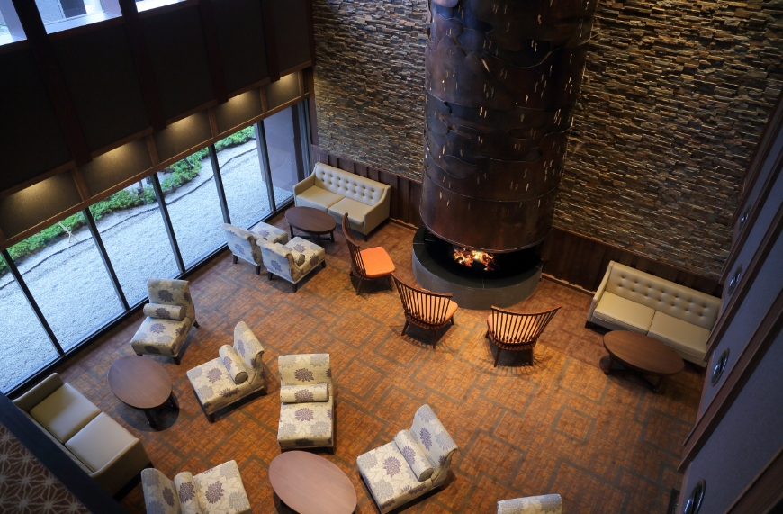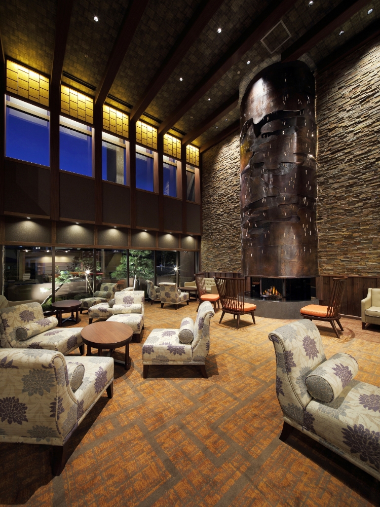 ホテルのシンボルでもある5m超のロビーの暖炉は、「文明開化絵巻」がコンセプト。