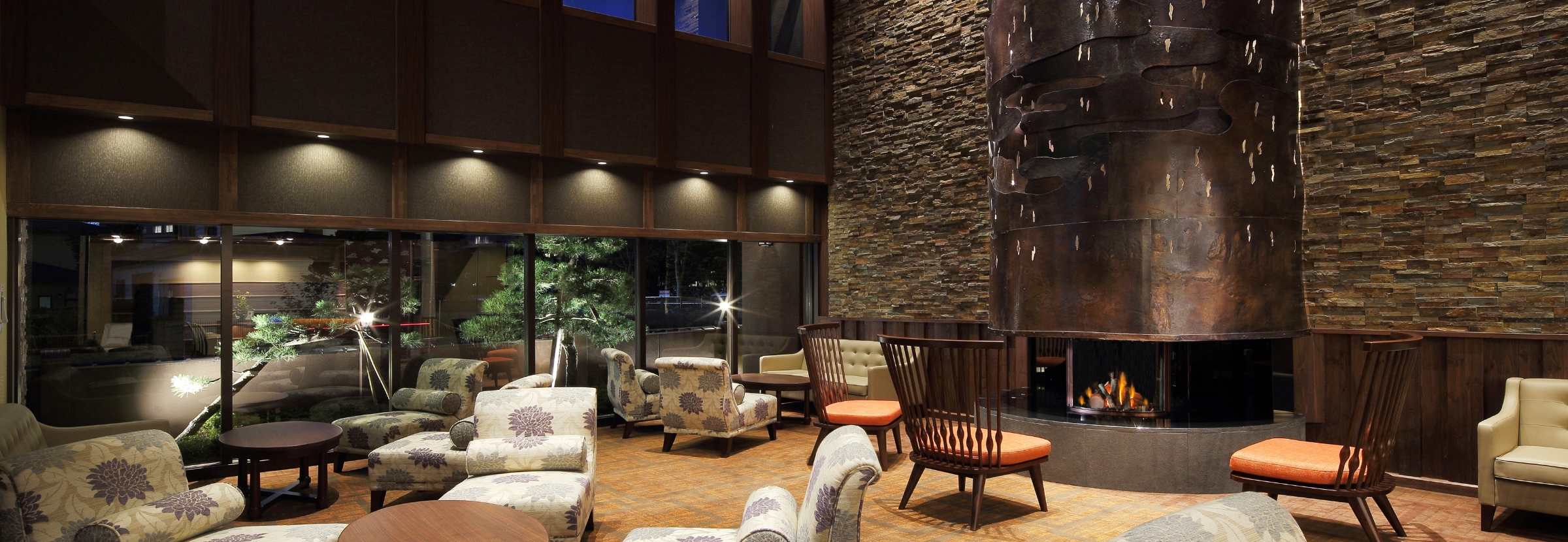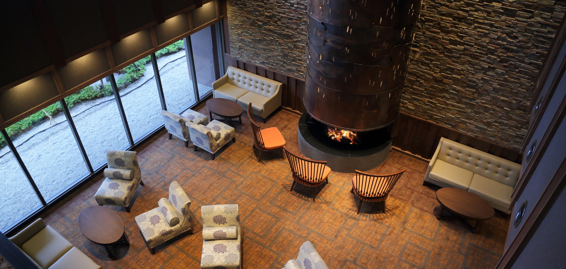 レトロモダンな建物と文明開化絵巻をコンセプトにした巨大暖炉が出迎え、