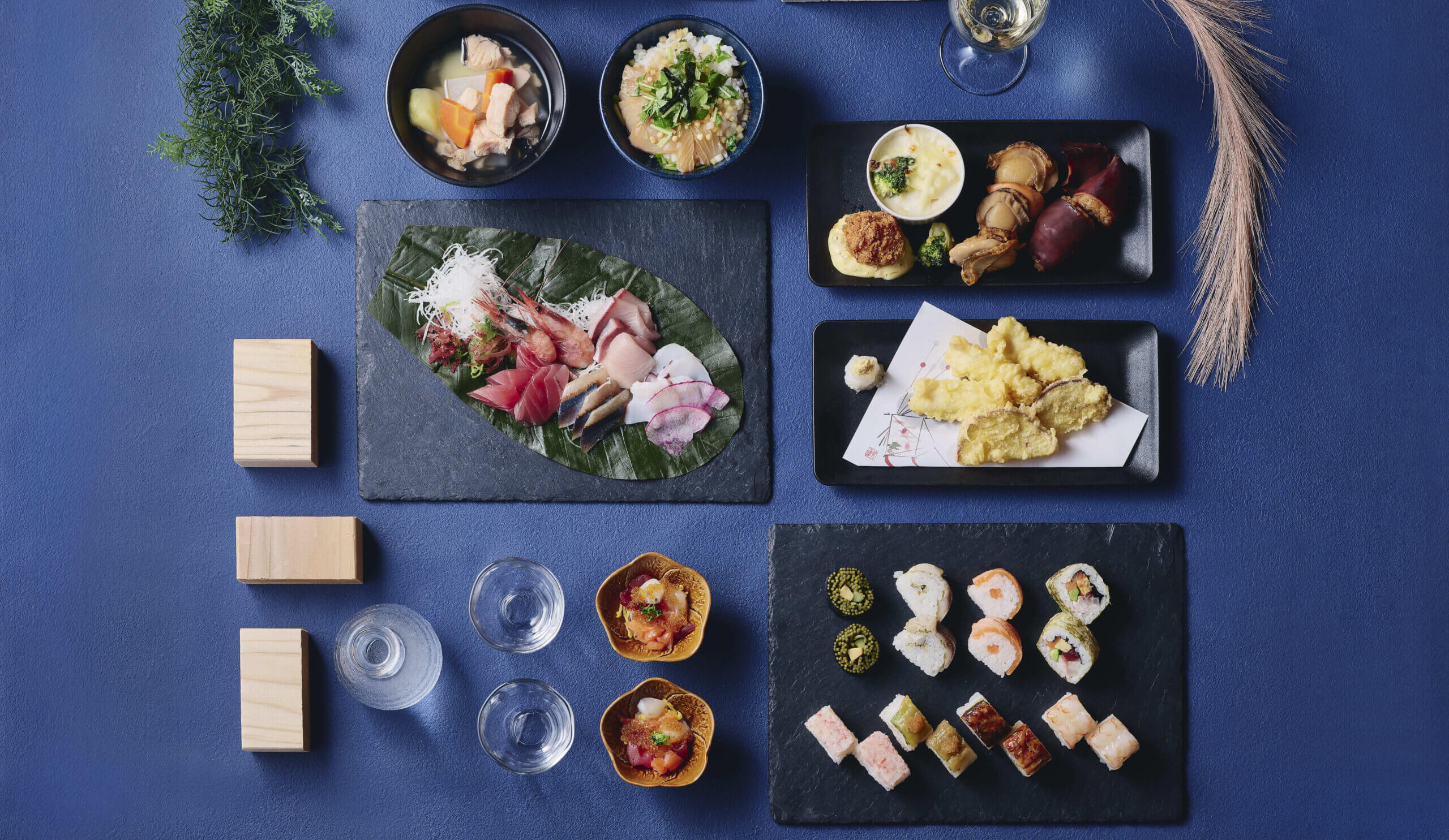 彩り豊かな"飾り寿司"や香ばしい音とともに焼き上げる鉄板焼き、とろりとしたコクが魅力のラクレットチーズなど多彩な料理をお楽しみいただけます。